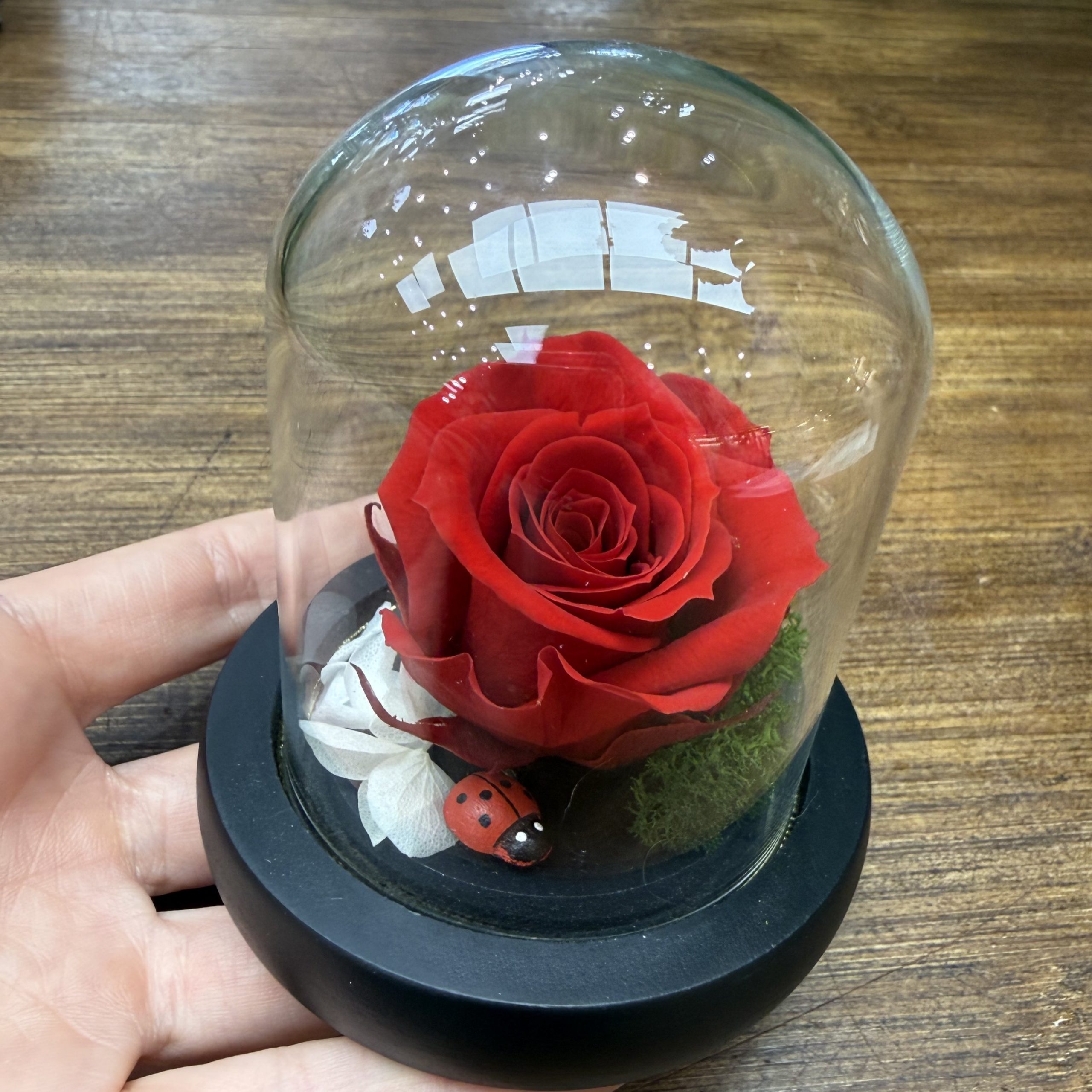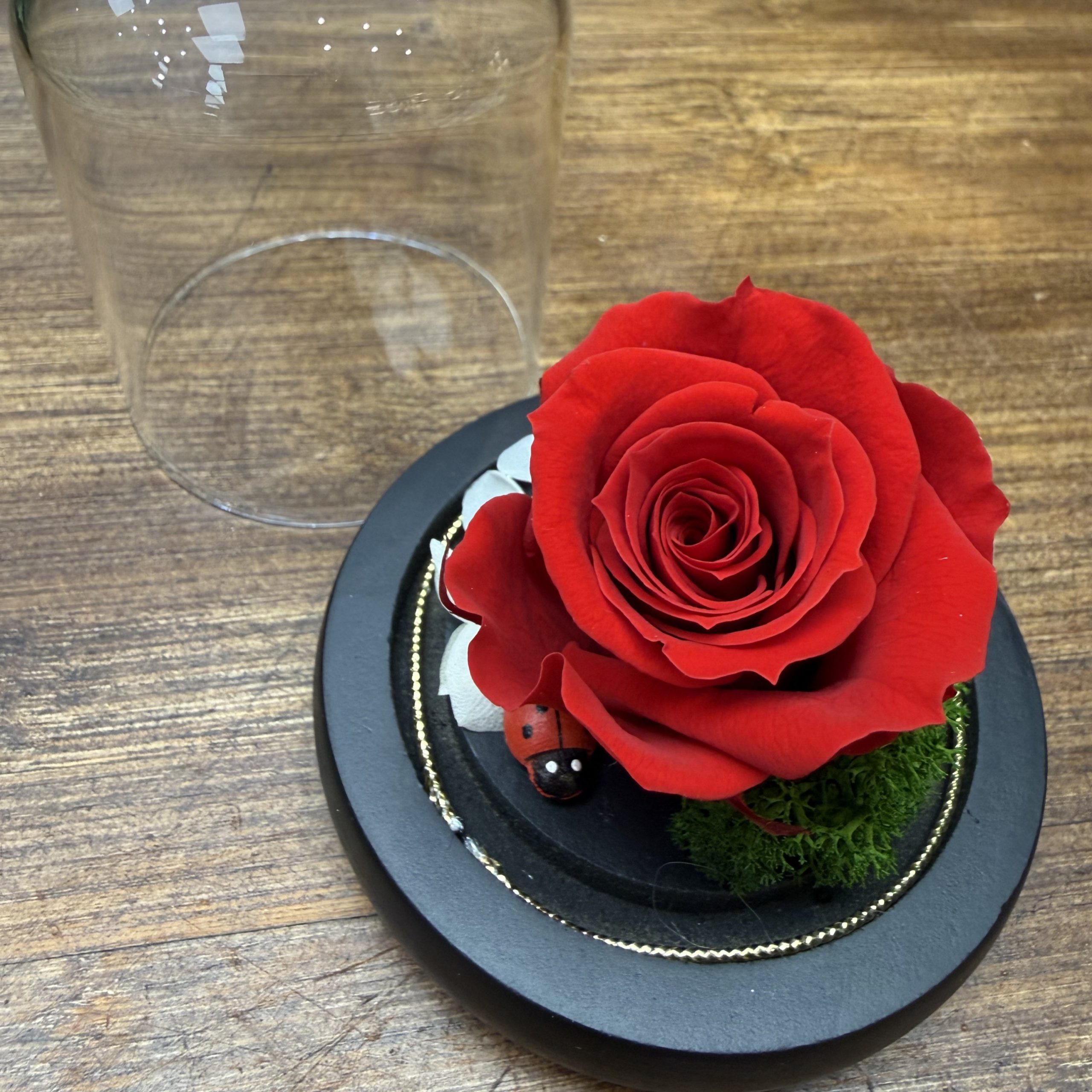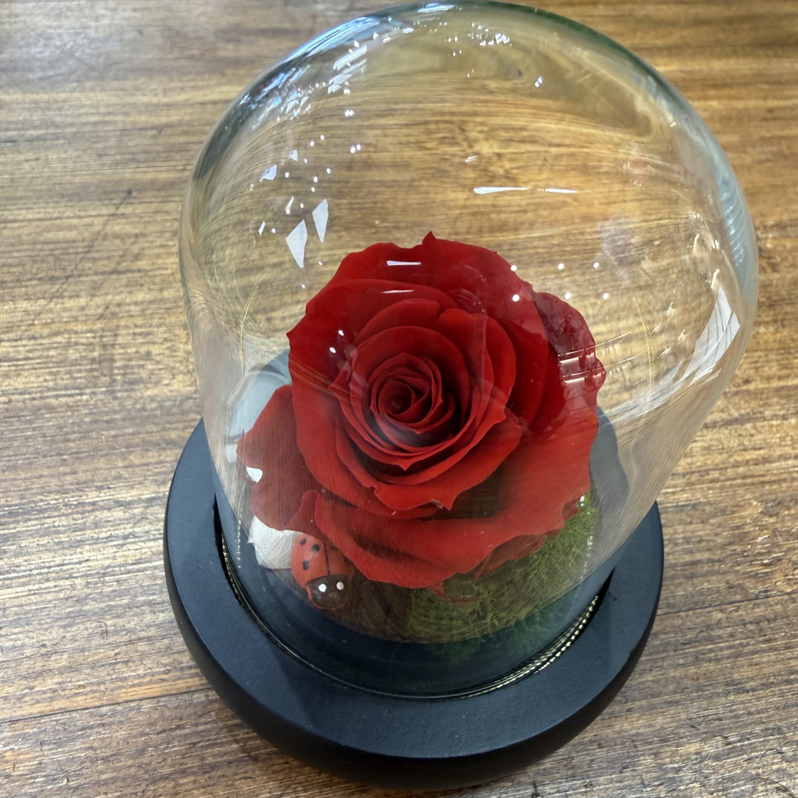 Cúpula de cristal mini de rosa preservada, color y modelo según disponibilidad. Altura aproximada 10cm. La base puede ser en color madera o negro, según disponibilidad
