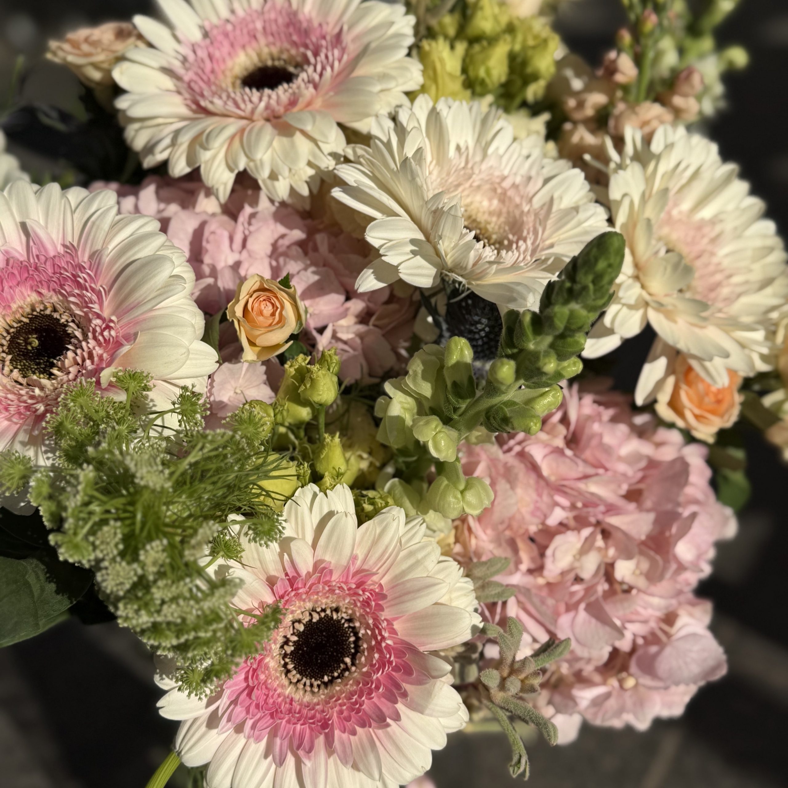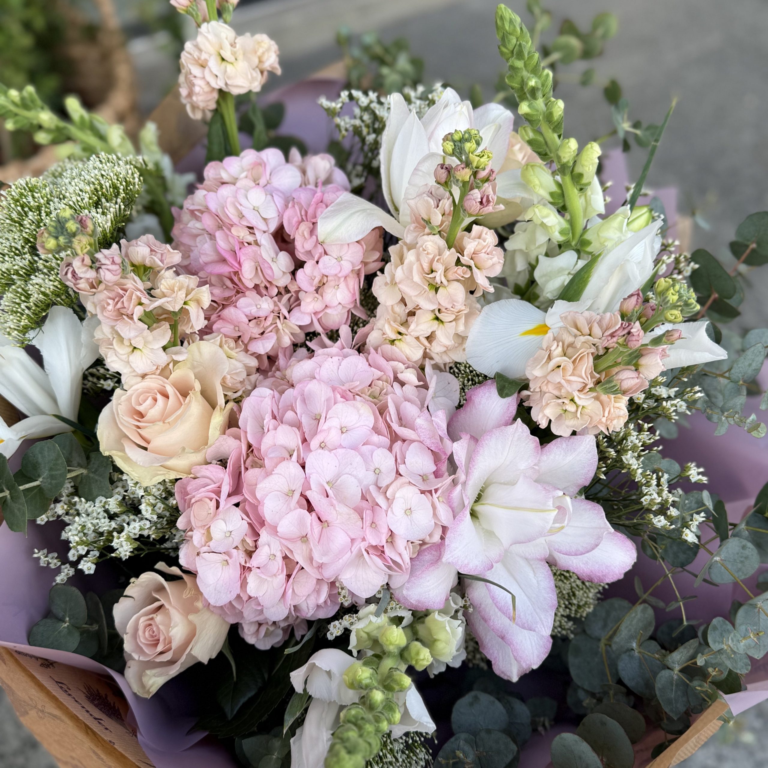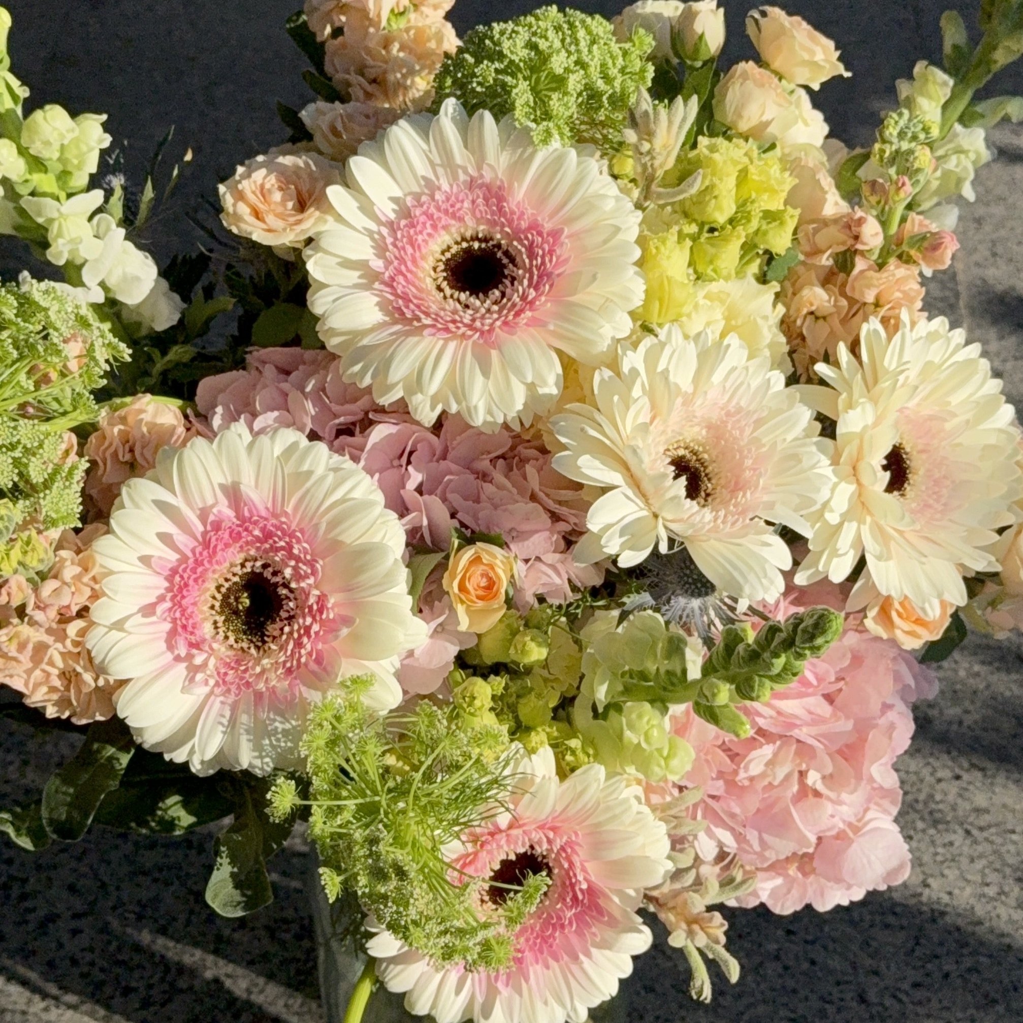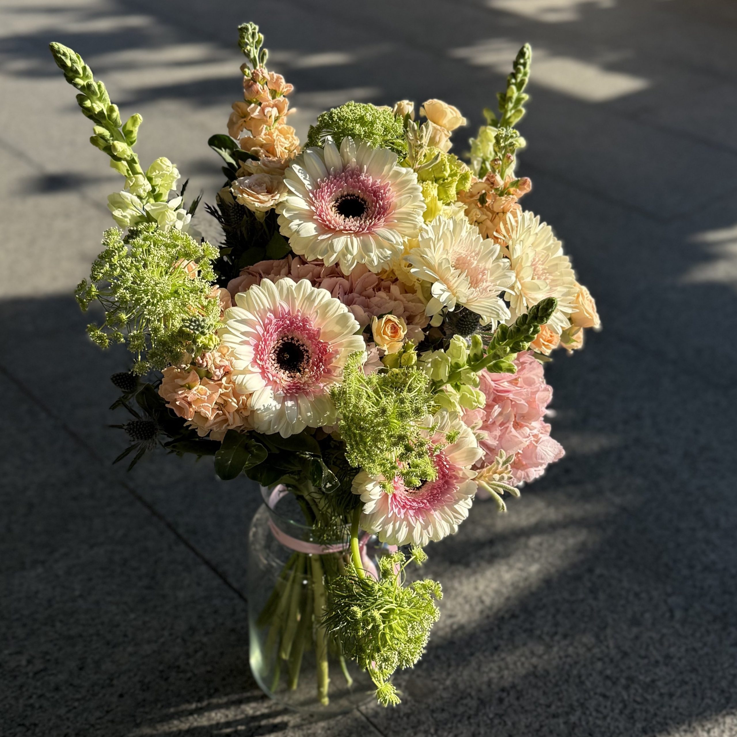 Ramo con flores de temporada a elección de florista en estilo romántico donde predominarán los tonos suaves rosados