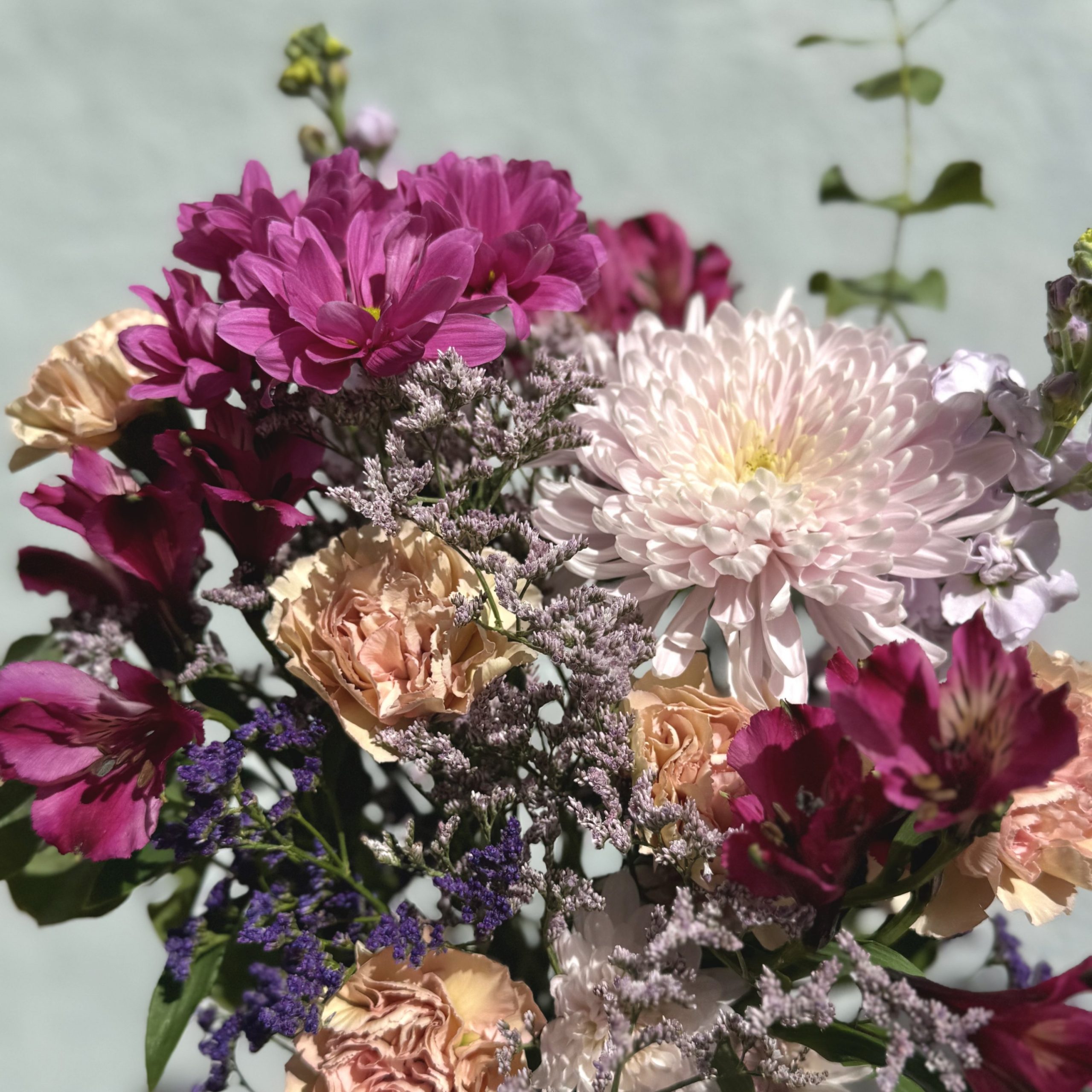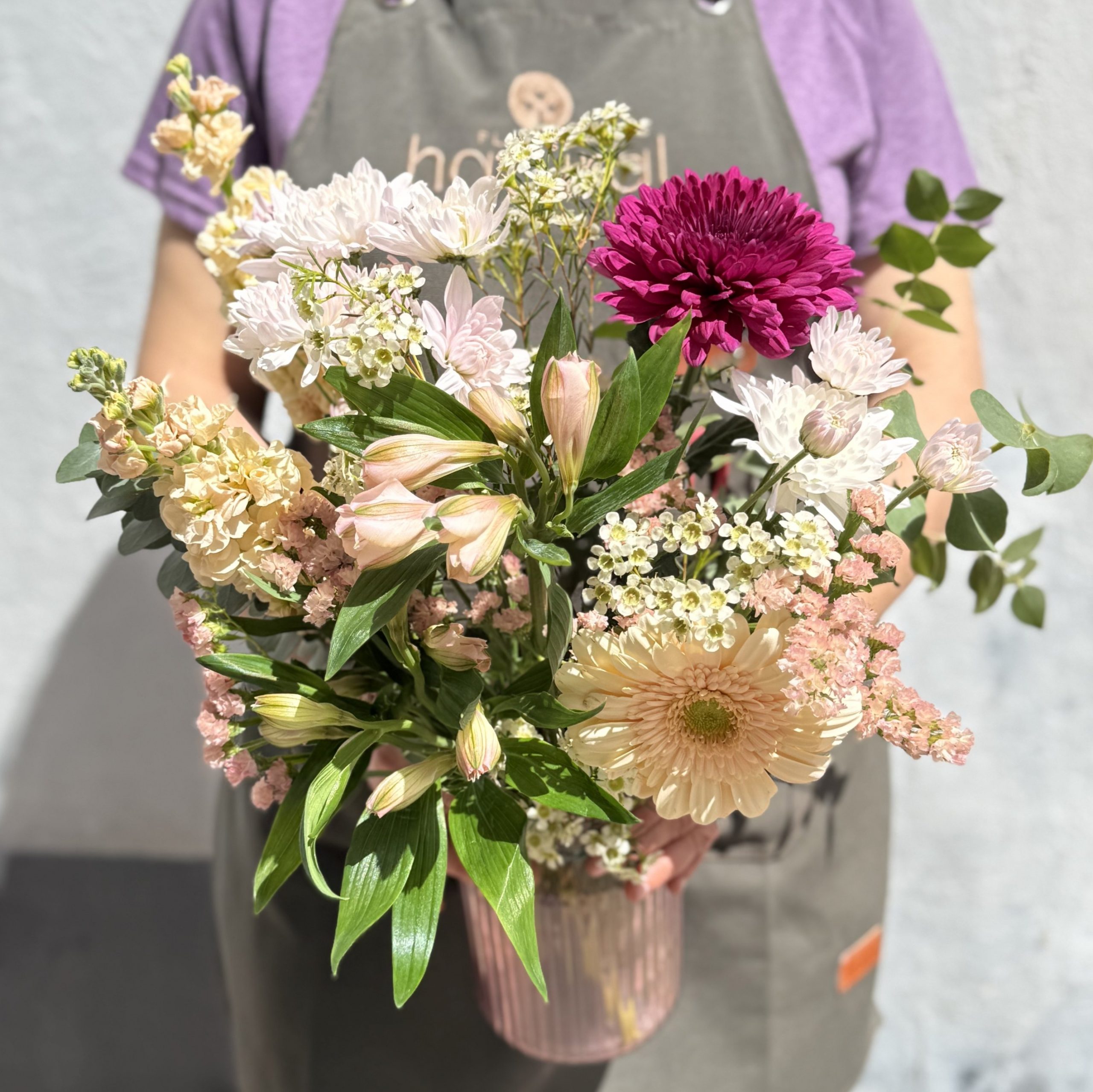 Ramo con flores de temporada, color y flores según disponibilidad rosas.