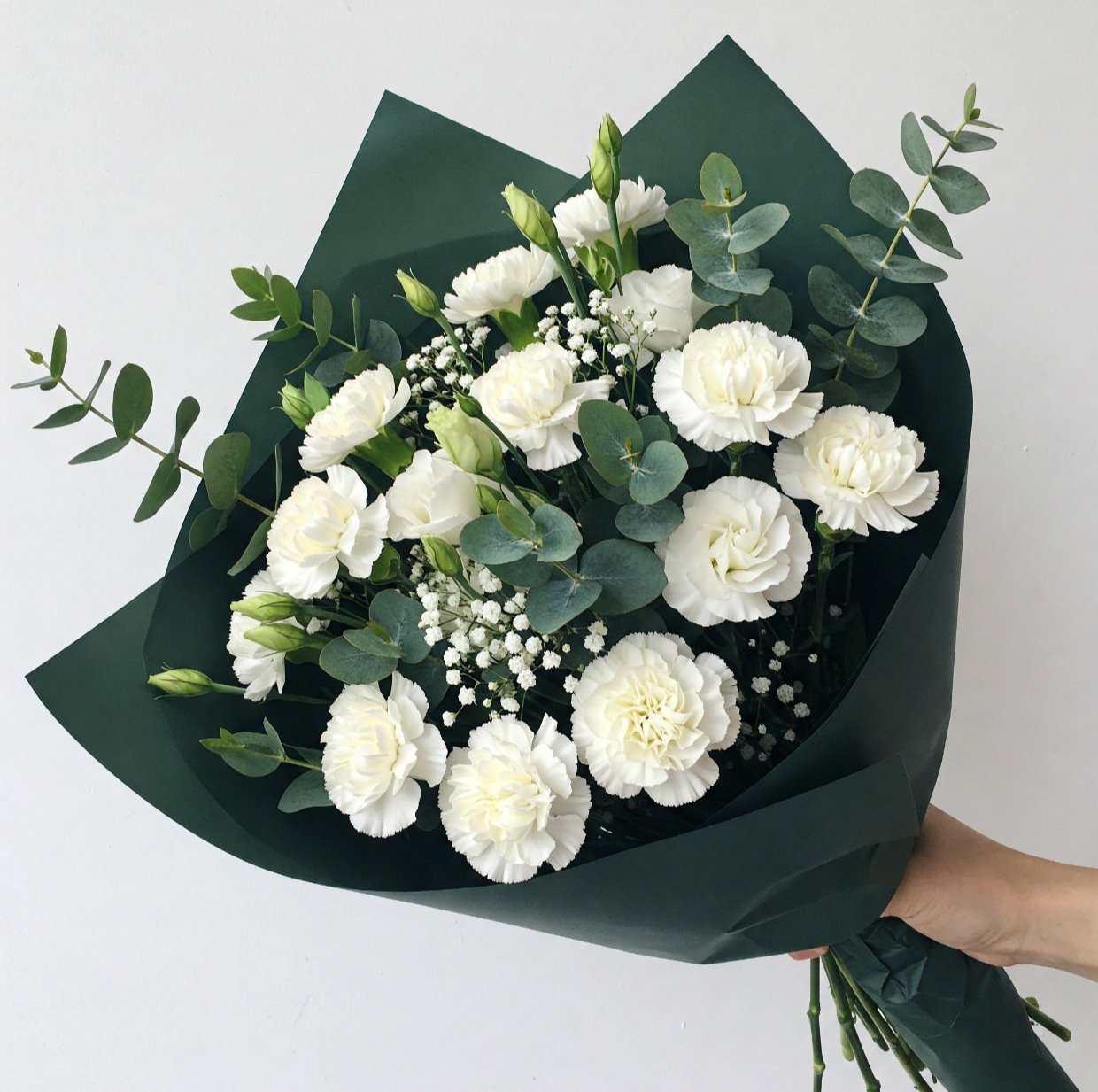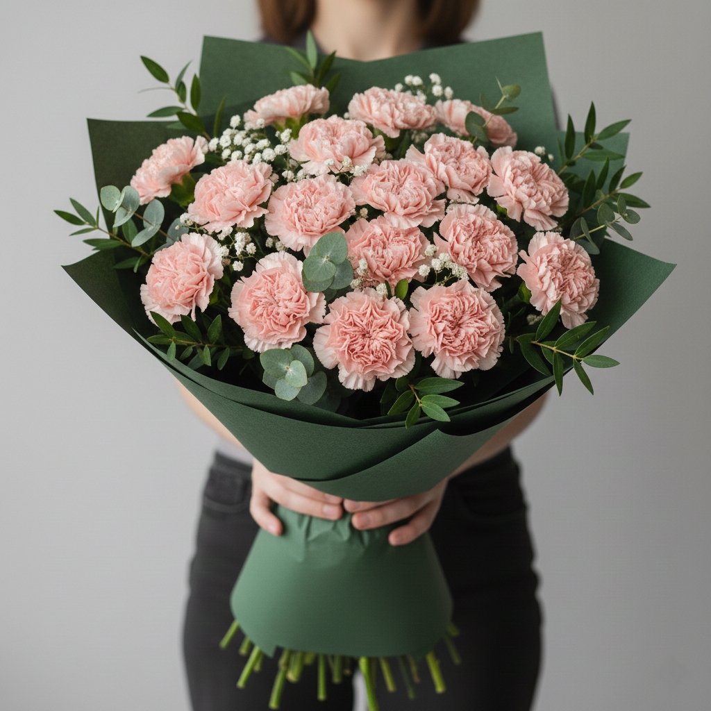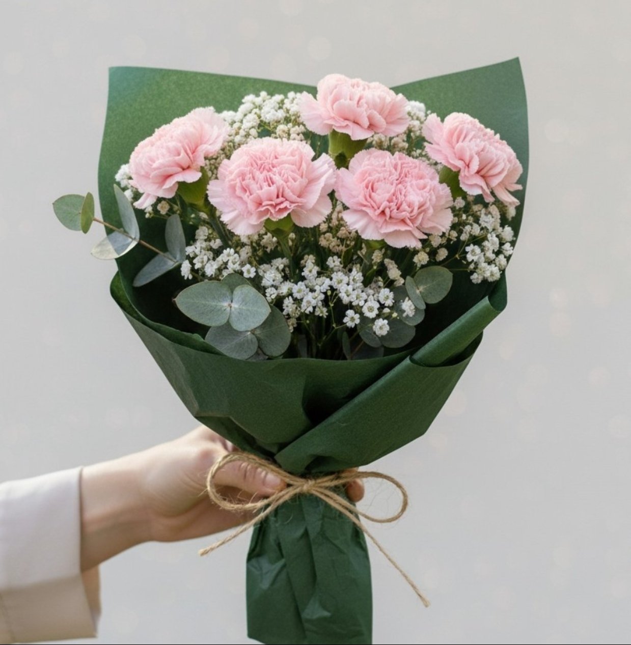 Ramo claveles con verdes y rellenos disponibles. Color del clavel según disponibilidad. Se entrega envuelto en papel y cinta de regalo.