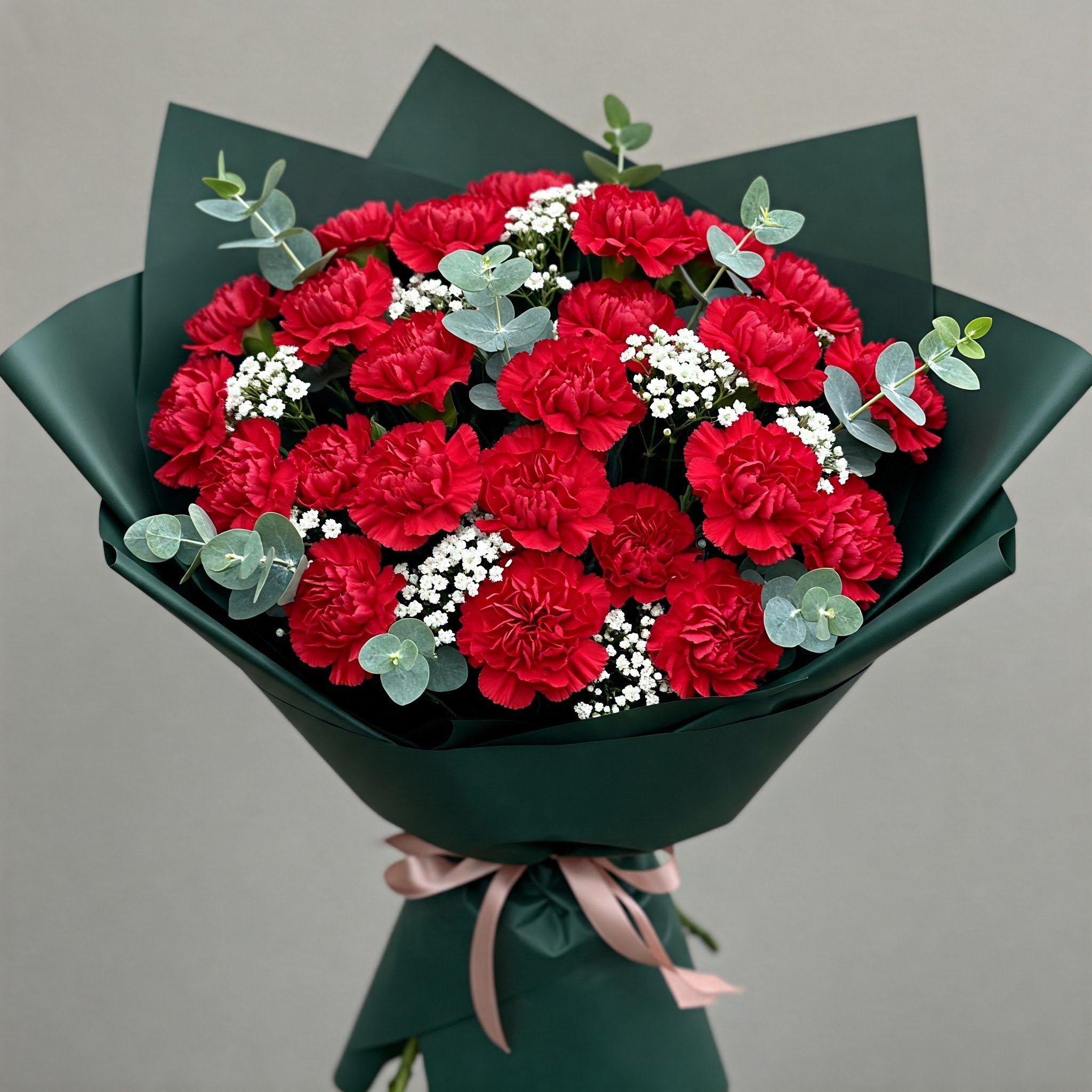 Ramo de 25 claveles rojos con paniculata y eucalipto. Se entrega envuelto en papel y cinta de regalo