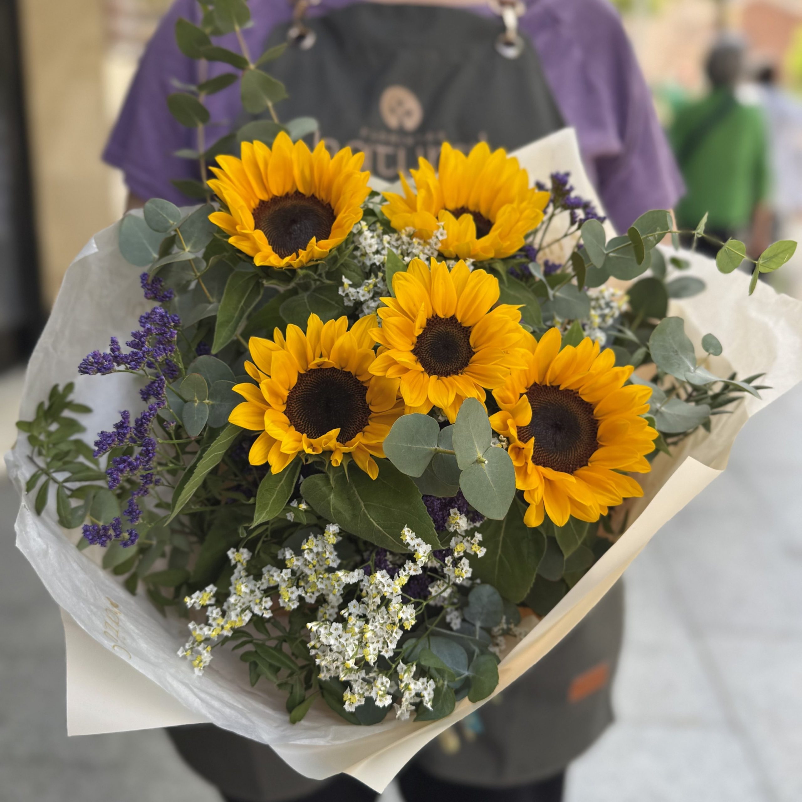 Ramo de 5 o 7 girasoles (opción a elegir). Con verdes y rellenos disponibles (fotos orientativas). Dependiendo de la temporada varía el tamaño del girasol y puede estar más cerrado y pequeño