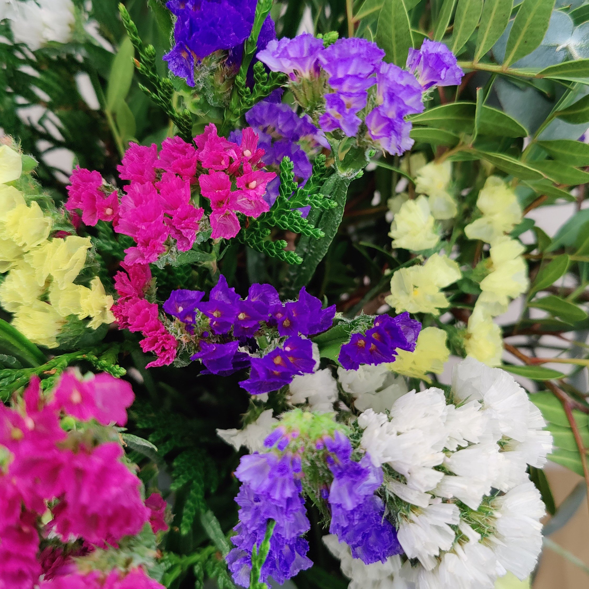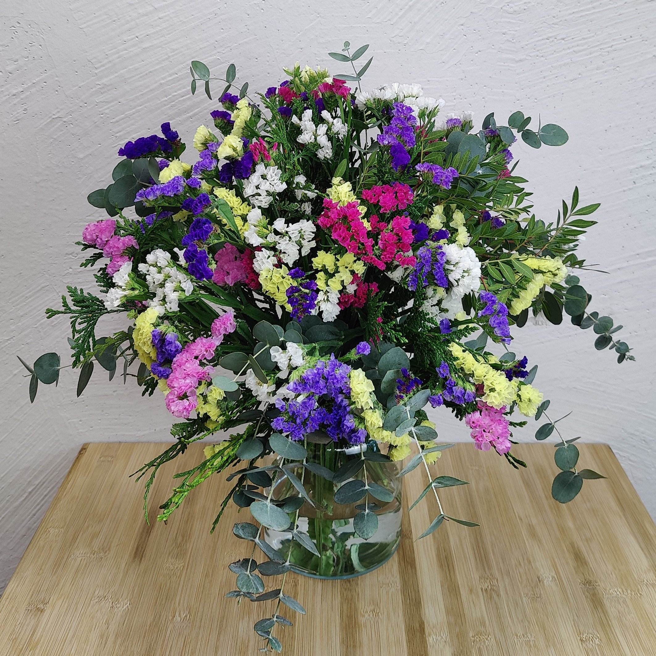 Ramo de Statice colorido. No incluye jarrón, ni decoración (foto orientativa). Según temporada los tonos pueden variar ligeramente. Con verdes y rellenos disponibles, se entrega envuelto en papel y cinta de regalo