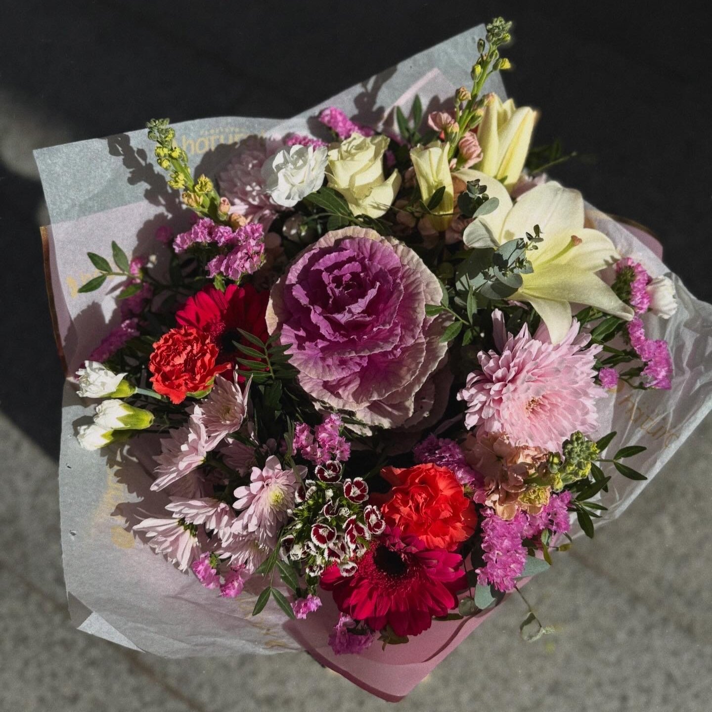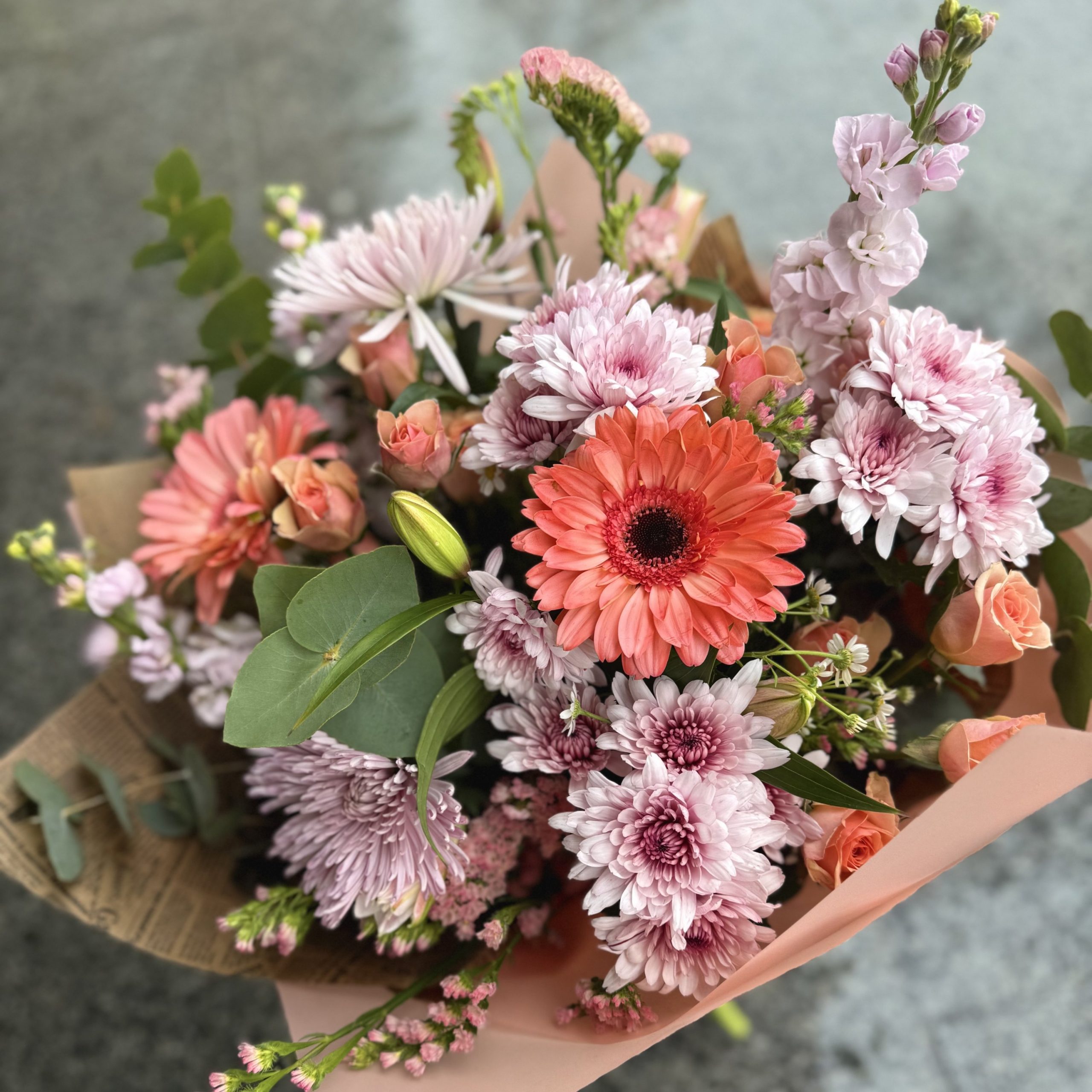 Ramo con flores de temporada en tonos fuertes.