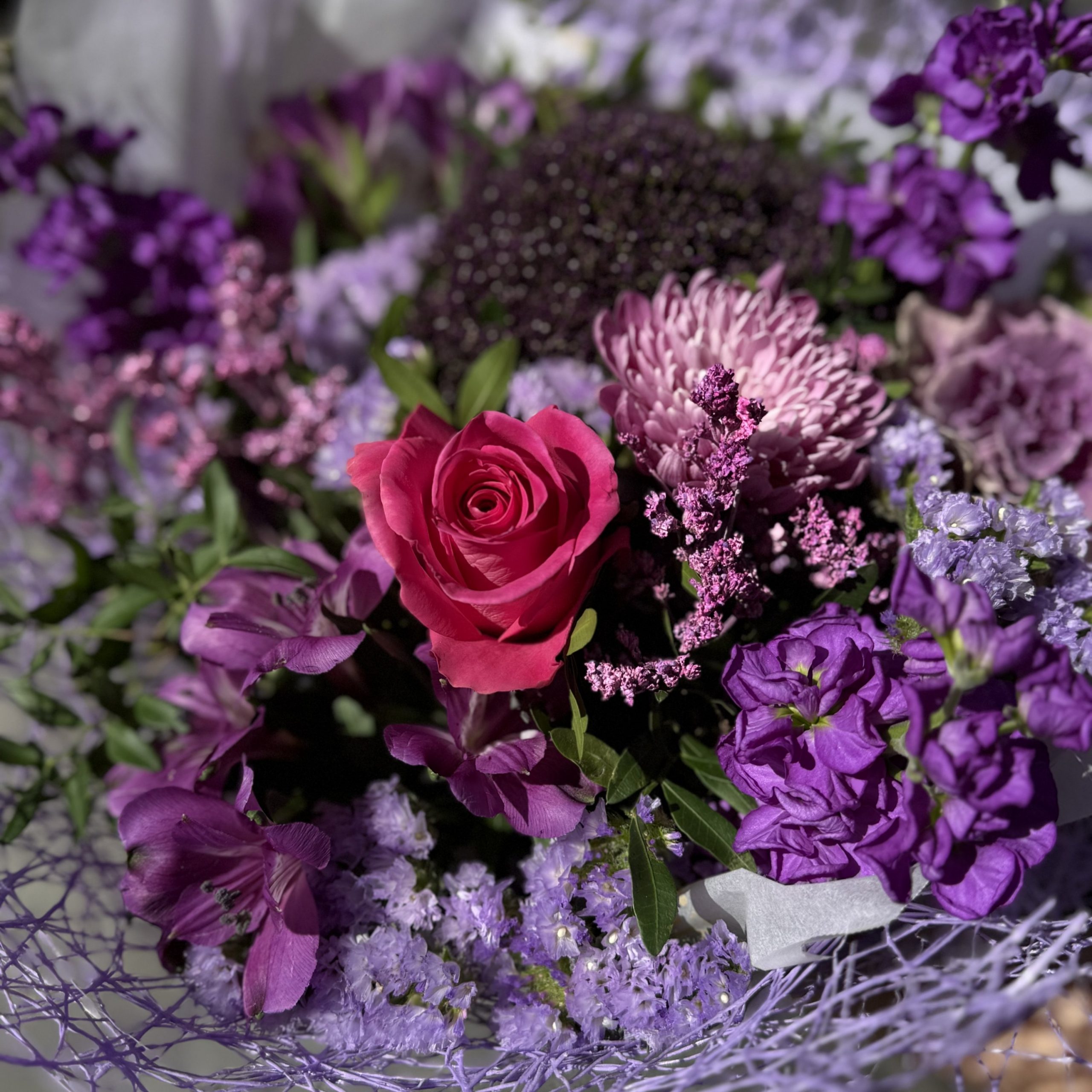 Ramo con flores de temporada en tonos violetas y rosados