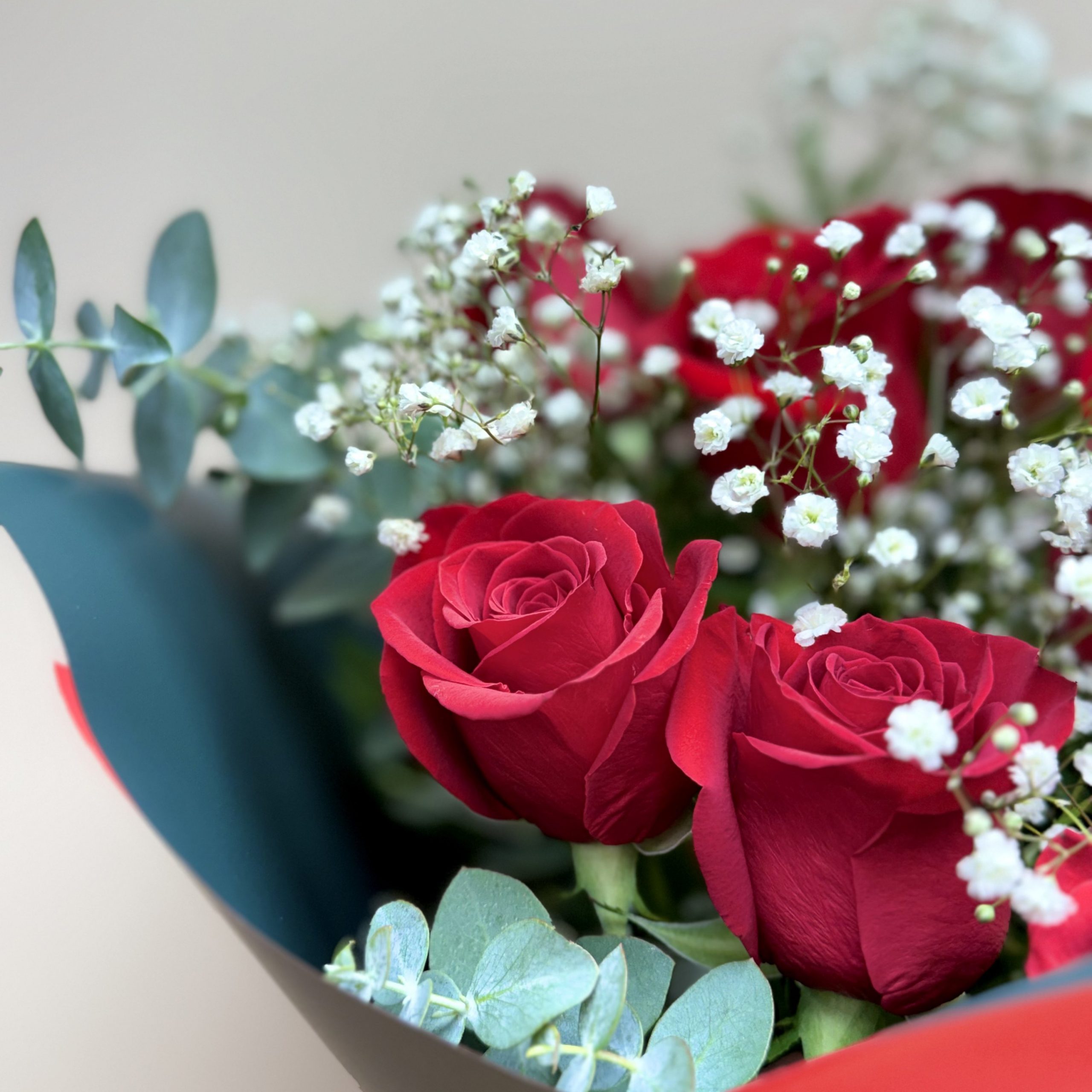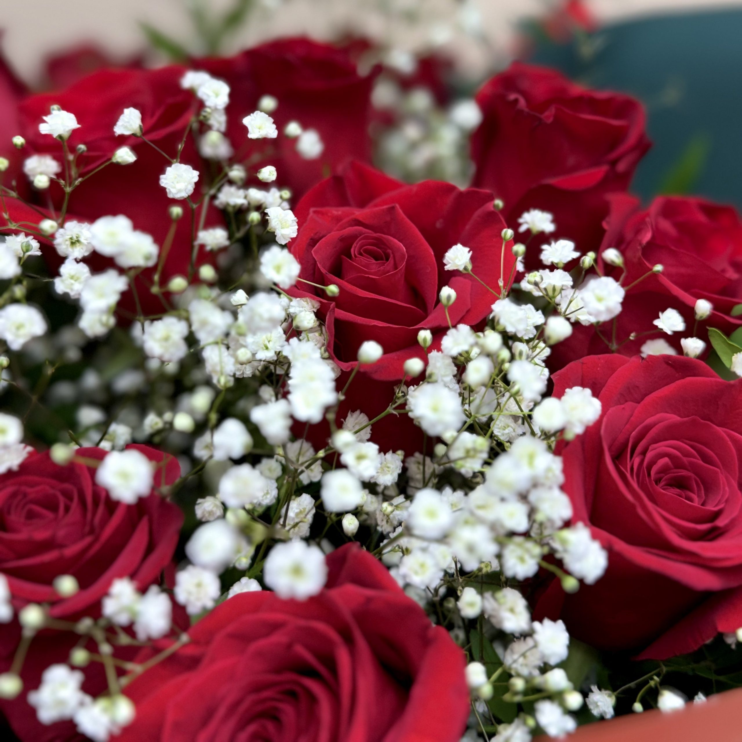 Ramo 18 Rosas rojas con verdes y rellenos disponibles.