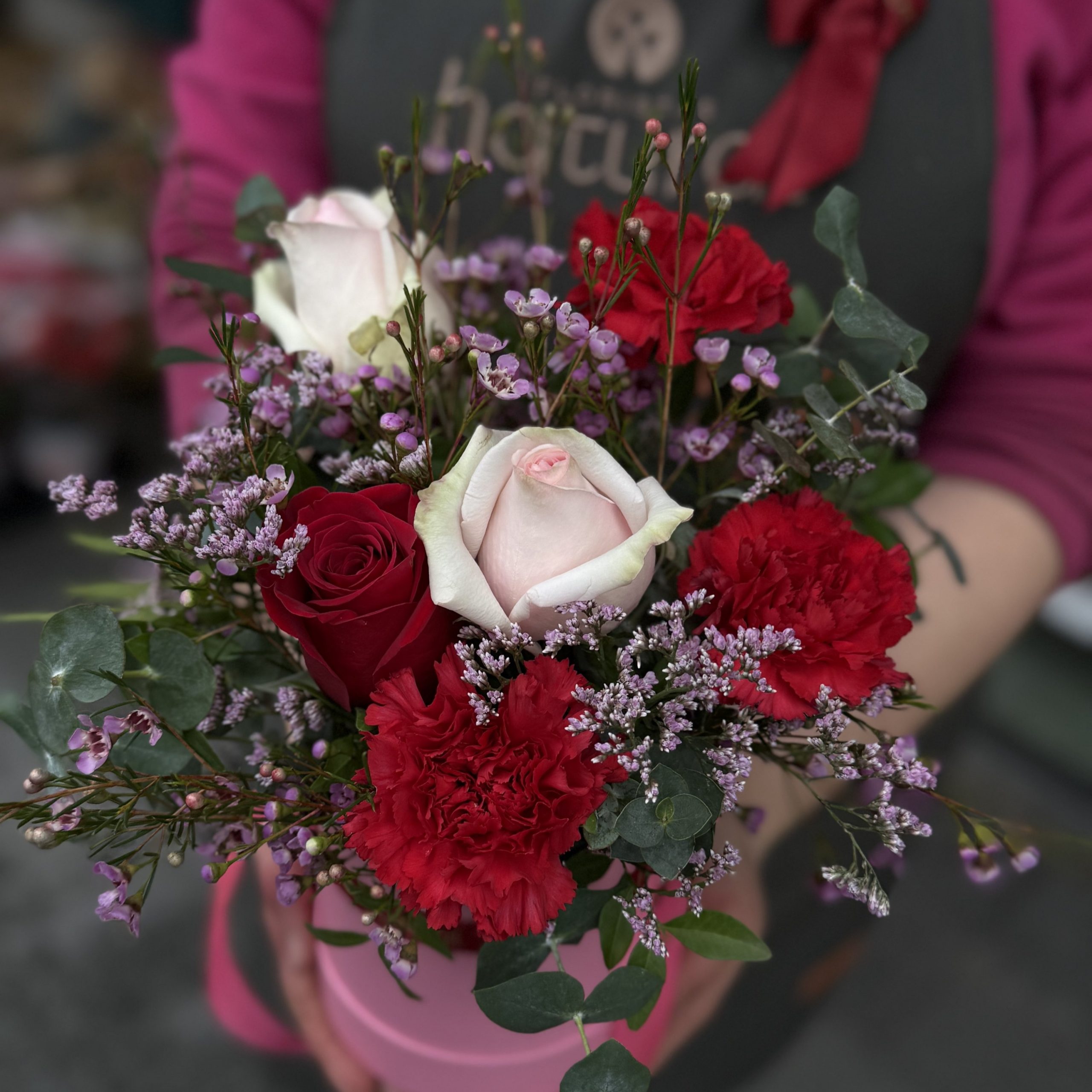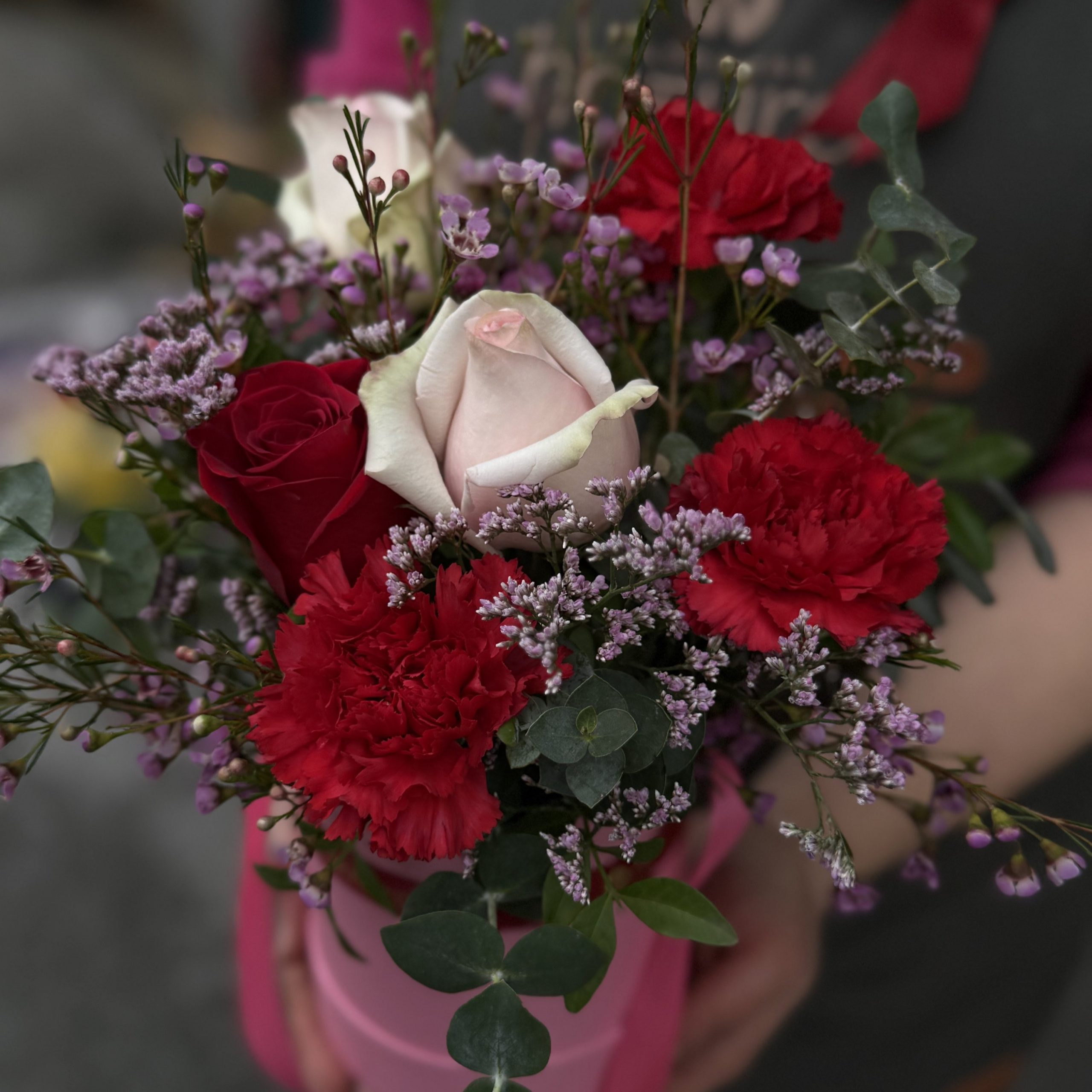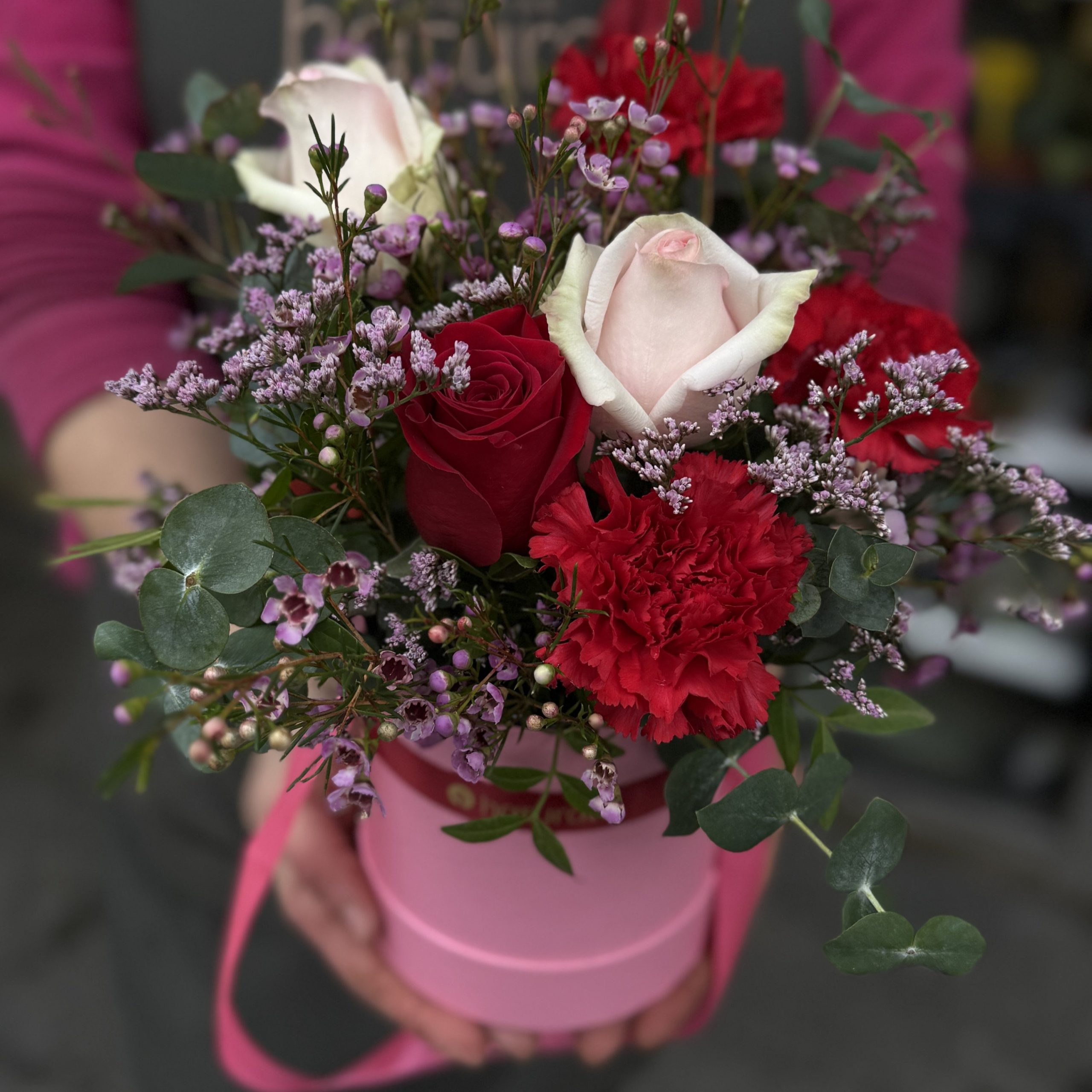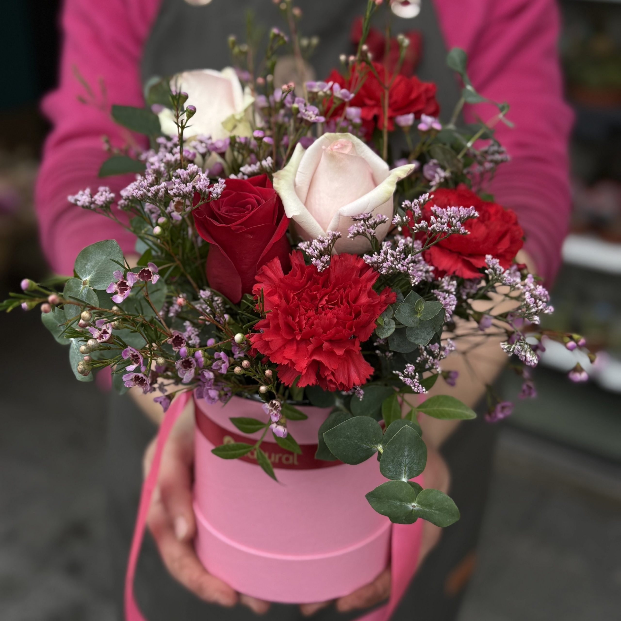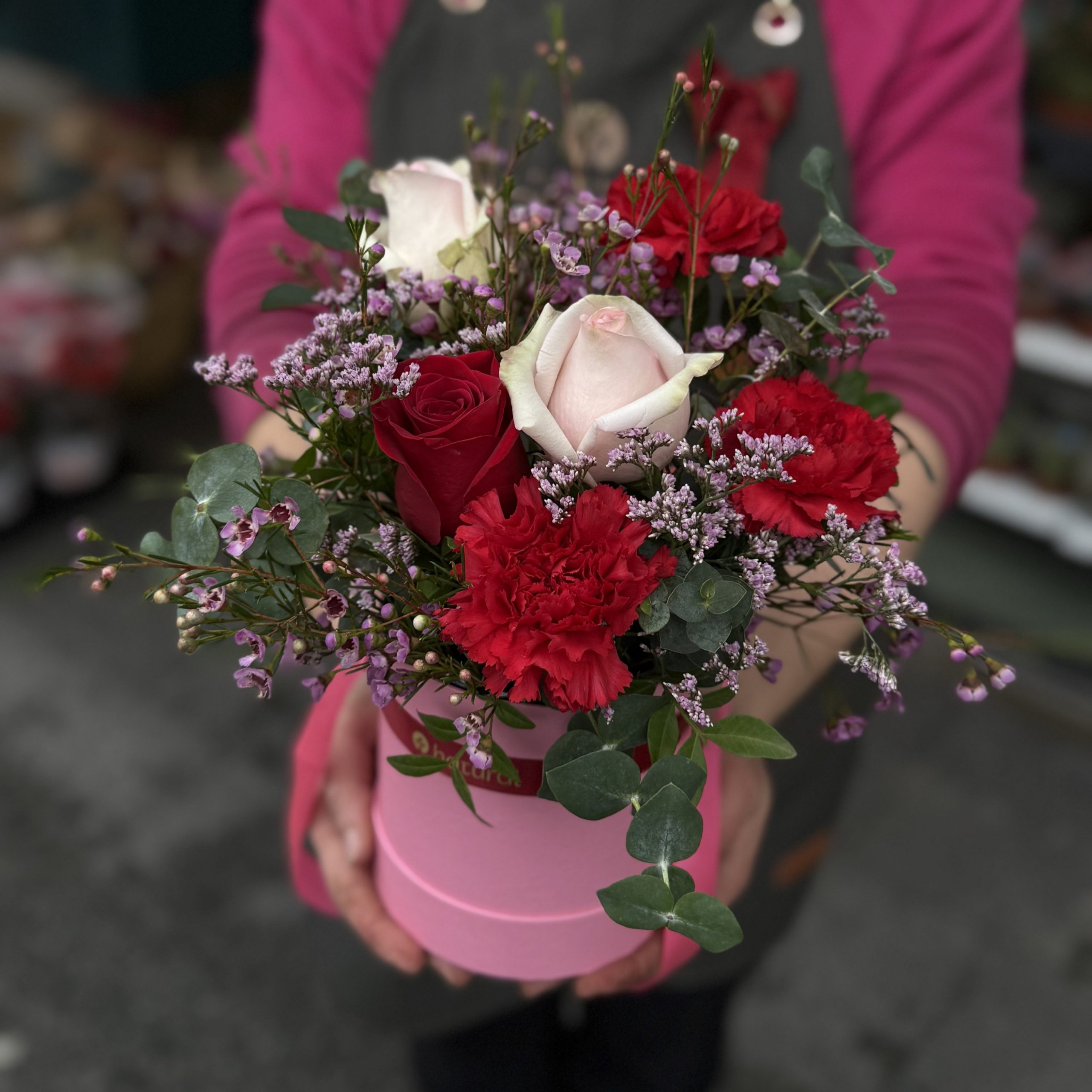 Sombrerera con lazada, composición con 3 rosas y otras flores según disponibilidad en colores rosados y rojos (fotos orientativas). Con verdes y rellenos disponibles. El color de la sombrerera puede variar entre blanca, roja, negra o rosa.