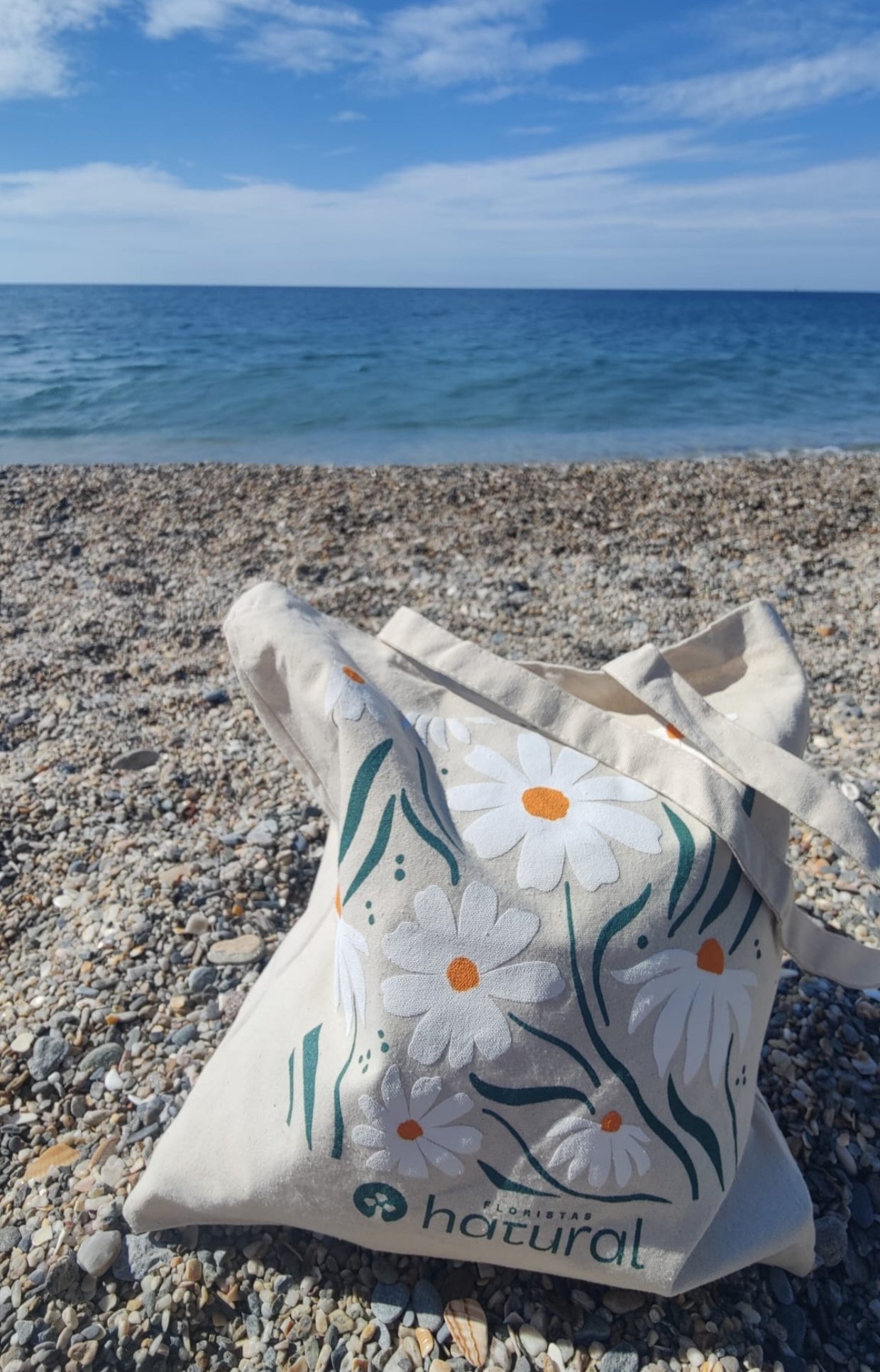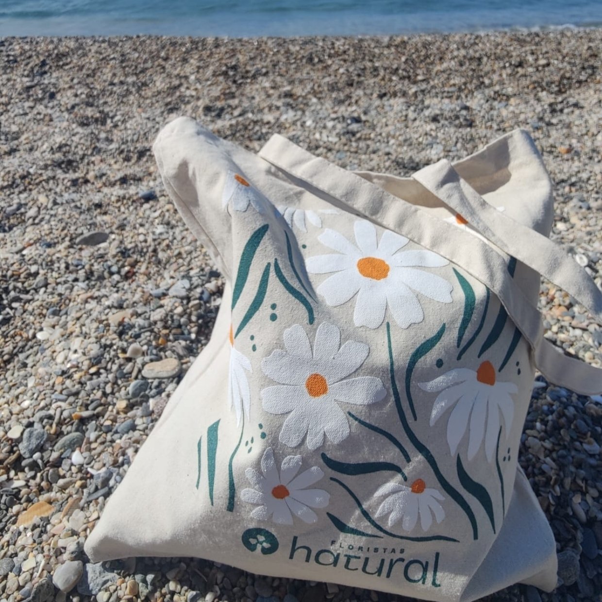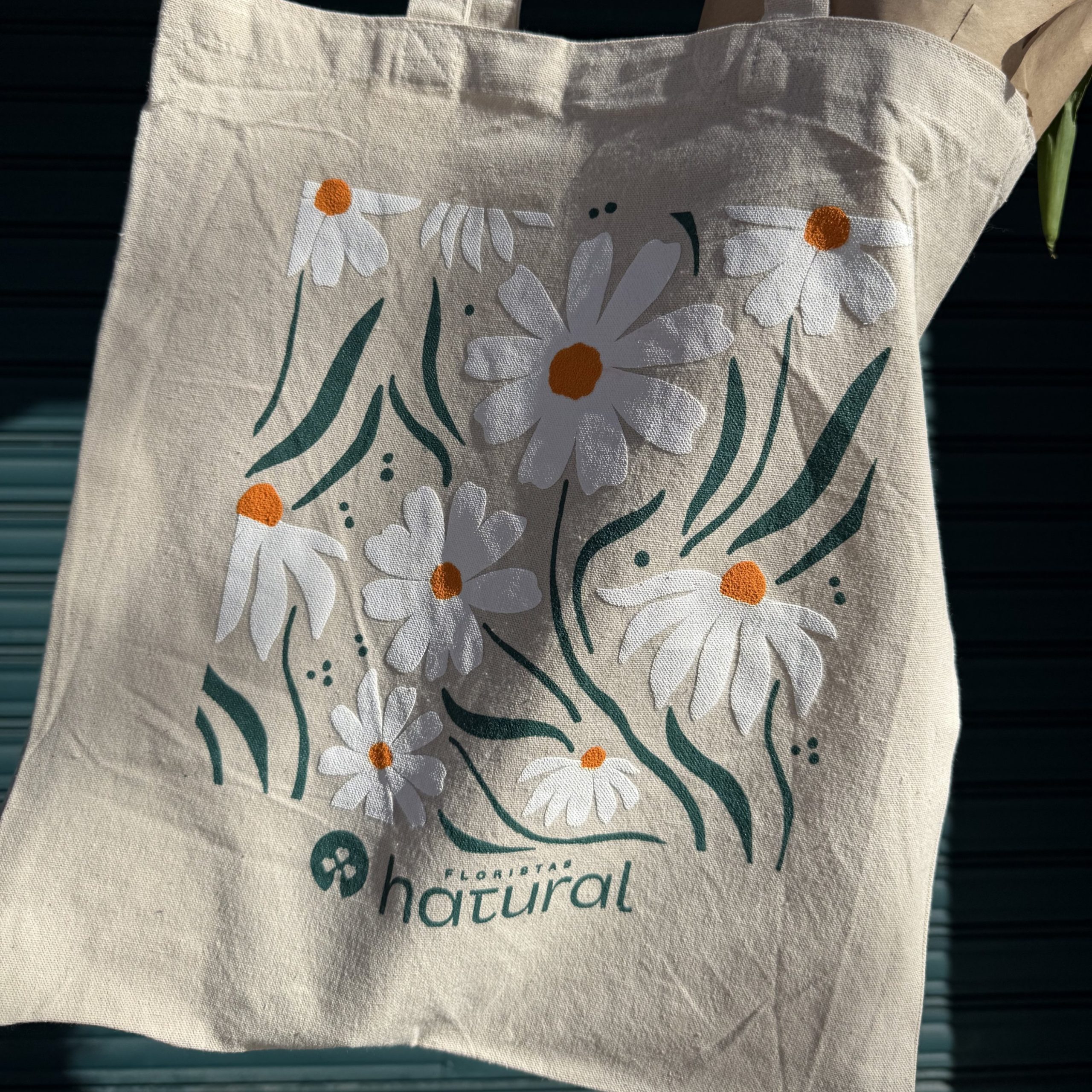 Bolsa de tela estilo tote bag con nuestro diseño de margaritas, para por ejemplo llevar tus flores!